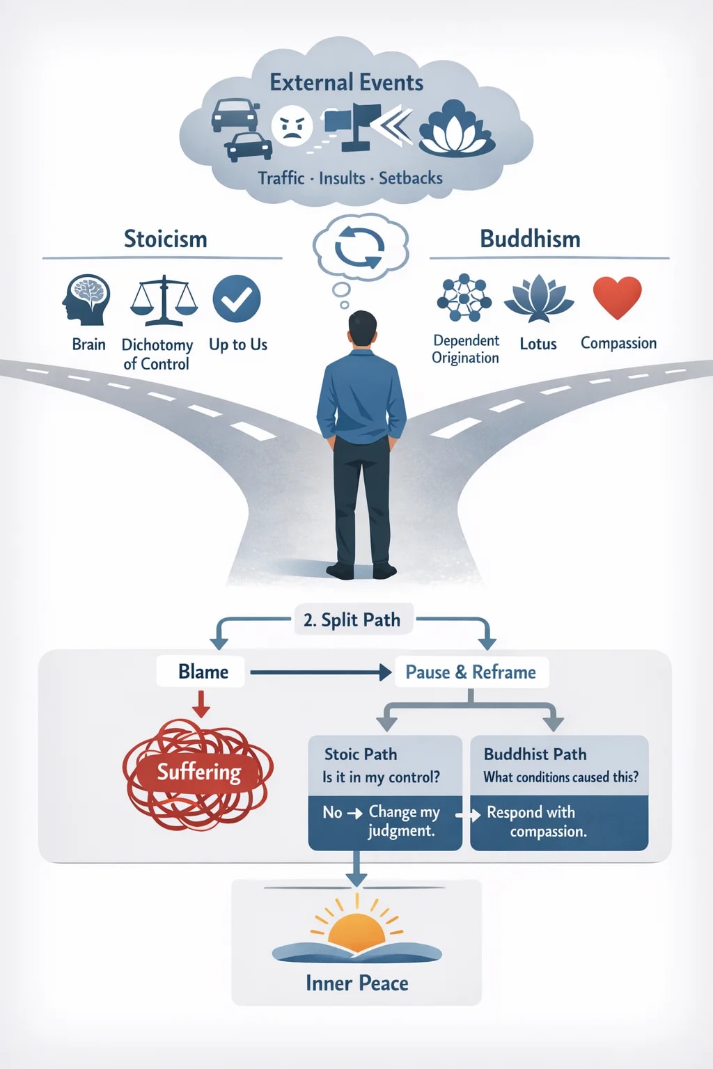 By integrating the Stoic practice of reframing our thoughts with the Buddhist insight of compassion for all beings trapped in the cycle of conditioned reactions, we can move beyond blame. This is not a path of passivity, but one of profound empowerment, where we reclaim our emotional autonomy and engage with the world with clarity, wisdom, and peace.