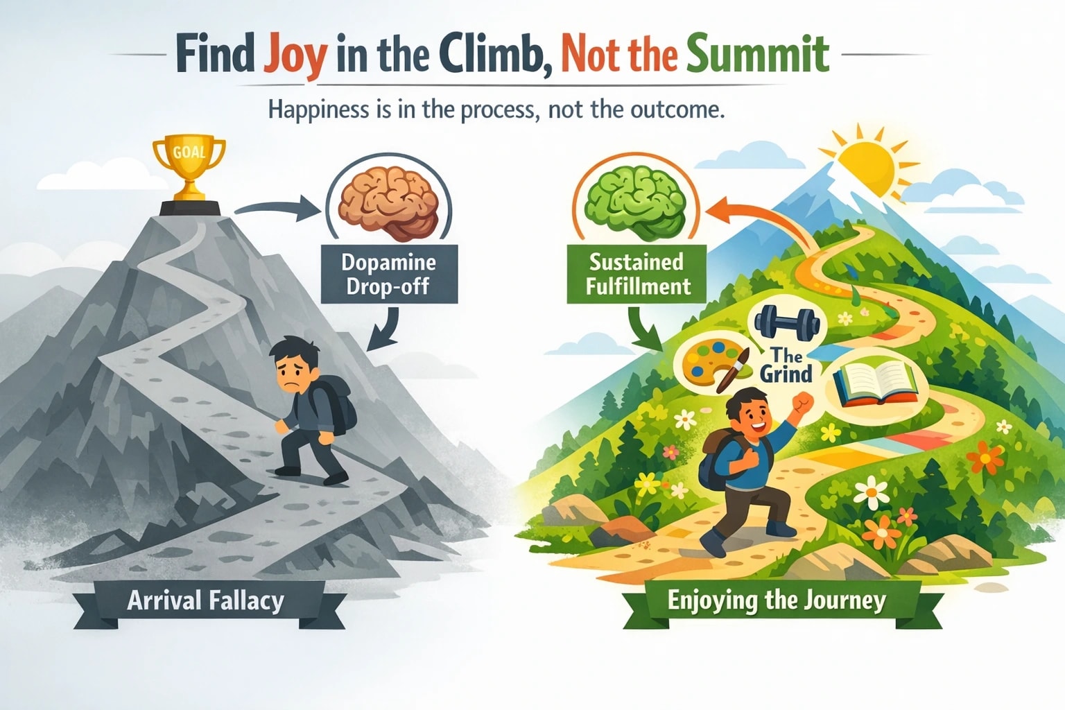The early mornings at his desk, wrestling with ideas, making incremental progress. That’s where the fulfillment lives. Process-oriented goals work because they provide constant feedback. Every workout, every page written, every problem solved is a small win—a dopamine hit that doesn’t vanish the moment you achieve it.