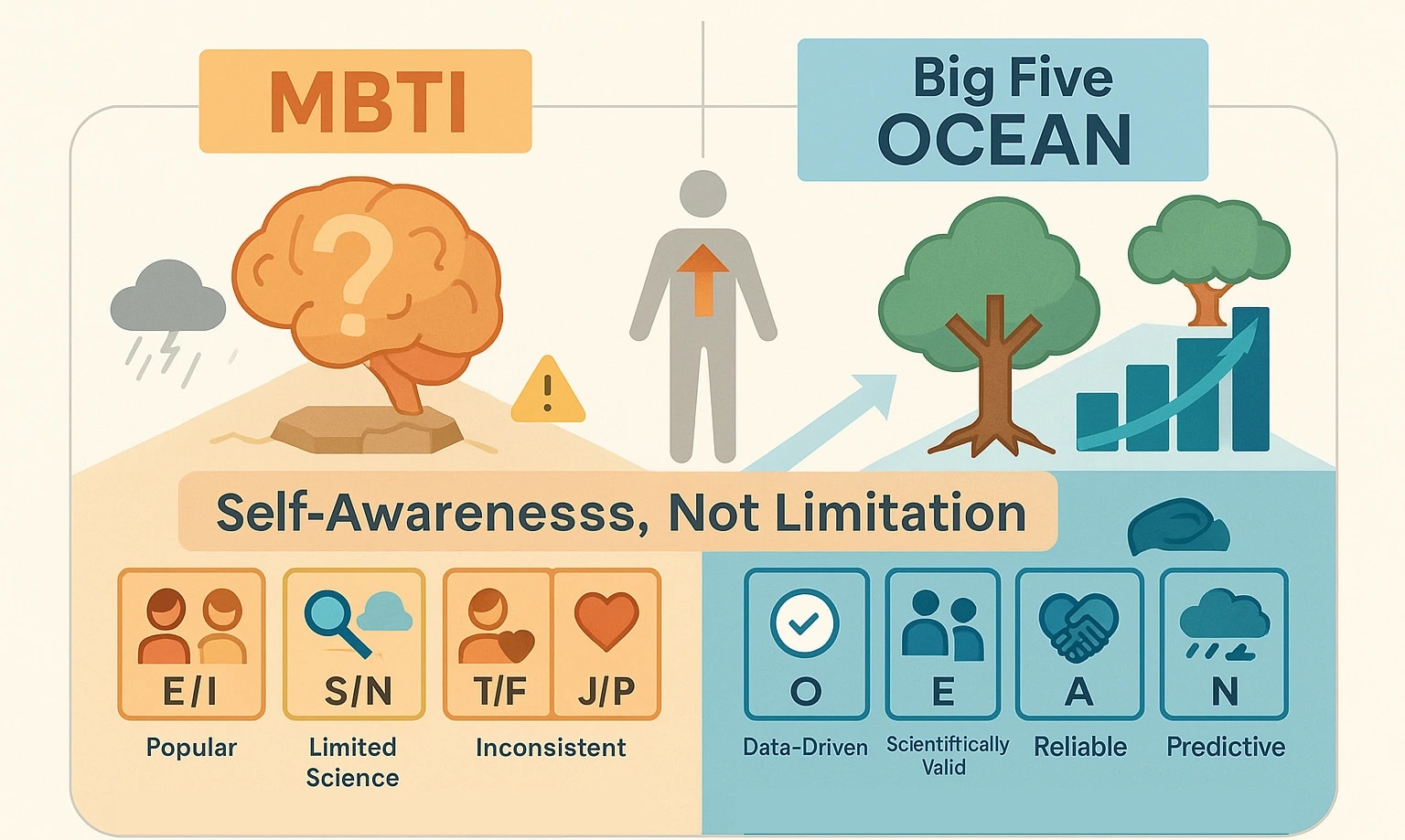 So, if the MBTI’s scientific foundation is a bit shaky, what are the alternatives? Enter the Big Five personality traits, also known as the Five-Factor Model (FFM).