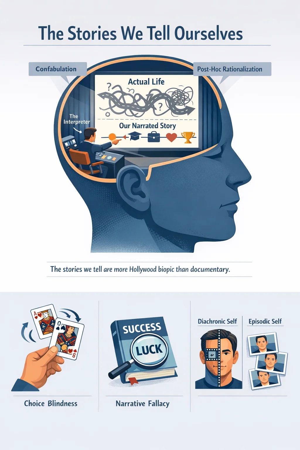 The more I dig into the science of memory and decision-making, the more I realize that our life stories are less like documentaries and more like Hollywood biopics—dramatic, compelling, and only loosely based on actual events. We’re not the authors of our lives; we’re the screenwriters, frantically revising the script to make the protagonist (ourselves) look good.