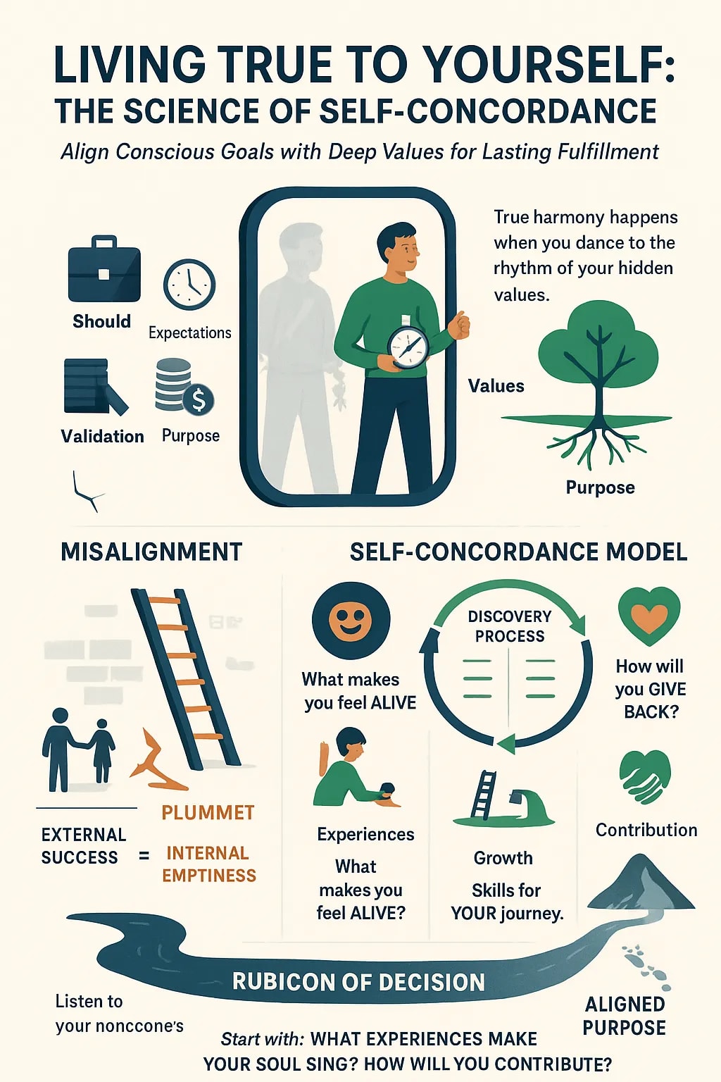 The science is clear: when we align our conscious goals with our deepest values, we unlock sustainable fulfillment that external rewards can never provide. Start today by asking yourself the three fundamental questions—what experiences do you want, how do you need to grow, and how will you contribute? Your authentic self is waiting to be discovered.