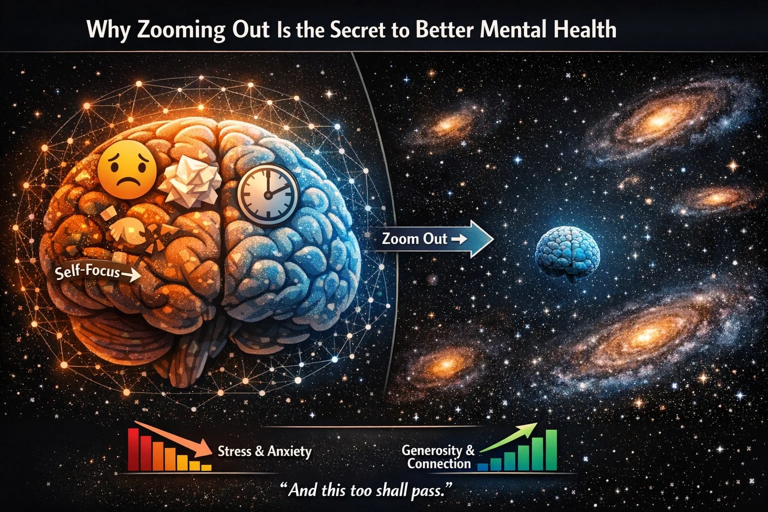The ancient Stoics had a term for this: the “view from above.” It’s the practice of zooming out—whether through time, space, or cosmic perspective—to see your problems as they truly are: small, temporary, and part of something much larger. Modern psychology calls this the “small self” phenomenon, and the research is clear: when we feel awe, when we recognize our place in the grand scheme, our stress shrinks. We become more generous, more connected, and—ironically—more at peace.